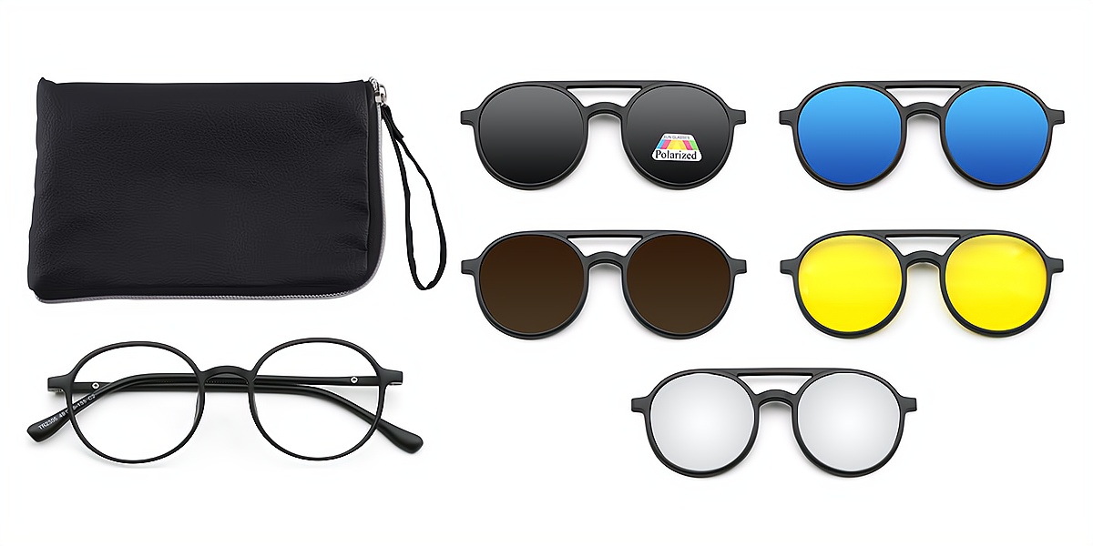 The package comes with 1 Optical glasses, 1 PU glasses bag and 5Pcs magnetic sunglasses clip(1 polarized clip included), the clip is colored, we recommend that you do not choose the lenses tint.